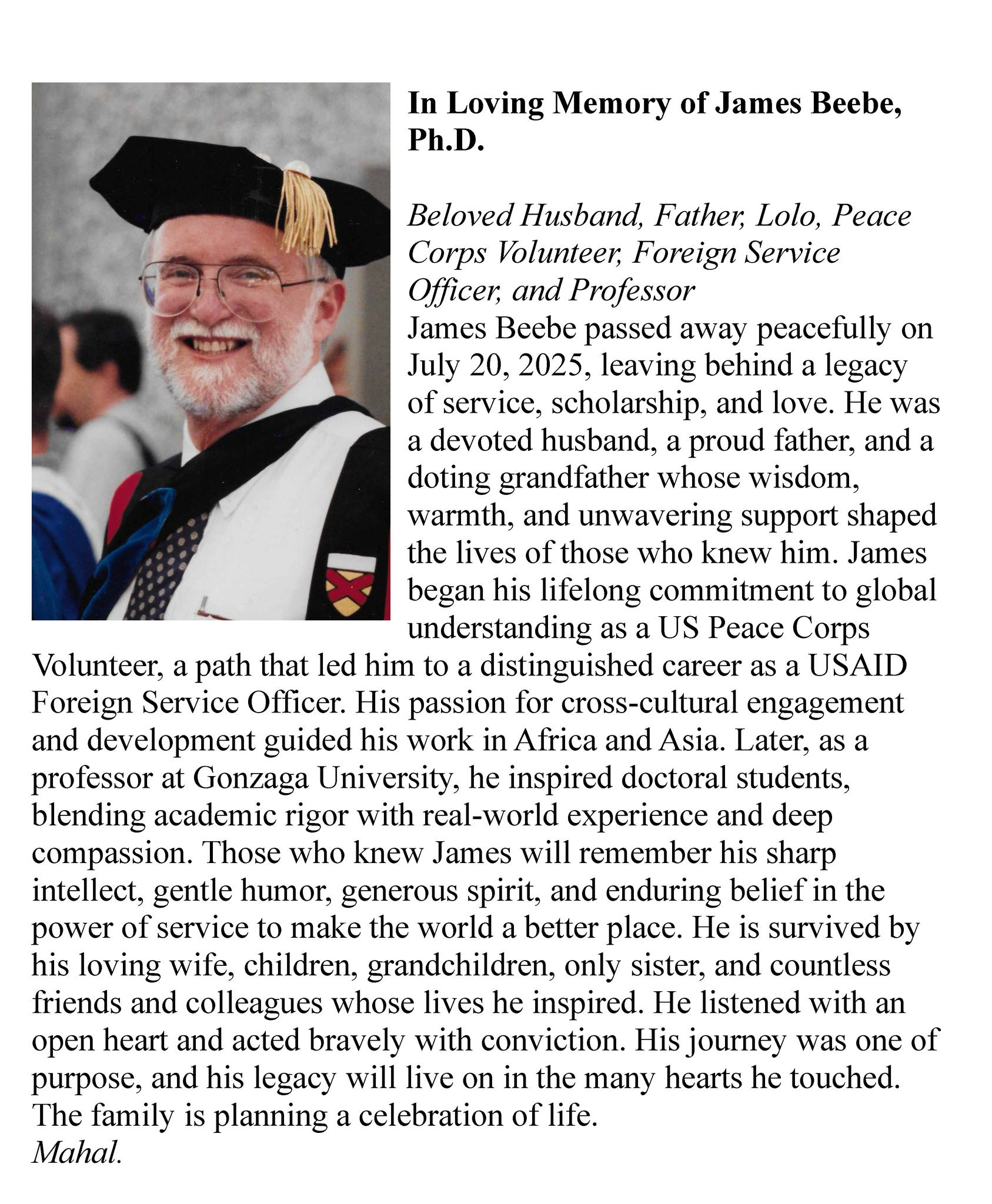 He leaves to mourn his passing his wife Penny, who was also a Foreign Service Officer in USAID, and three children (Krestin, Brian, Karyn); seven grandchildren and four great-grandchildren.
